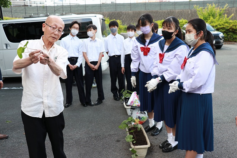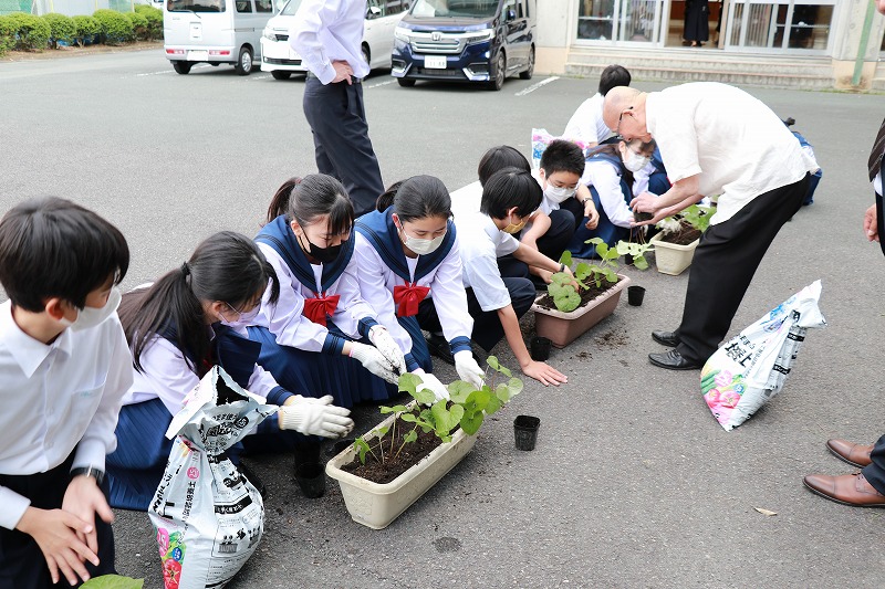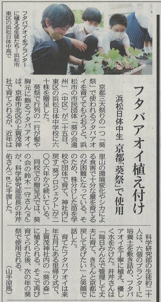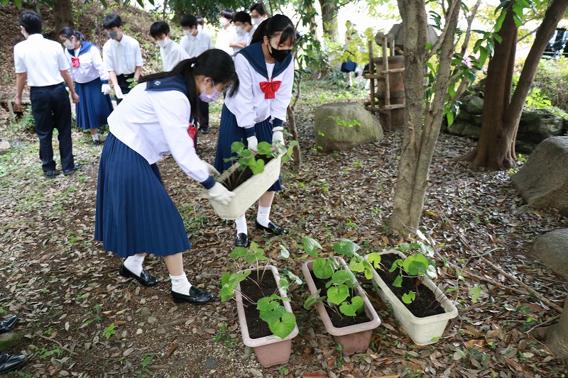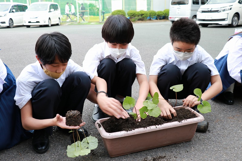 中学科学研究部の部員たちが、浜松市の市民団体「葵の会遠州」より京都三大祭りの1つである「葵祭」に使われるフタバアオイ60株をいただき、植え付けを行いました。フタバアオイは近年、環境の変化により自然植生が減少しており、祭りで使用されるフタバアオイを十分に育てることが困難となっているそうです。そこで株分けされた苗を学校や団体が育てて奉納する「葵プロジェクト」が2006年始まり、本校中学科学研究部がこれに参加することになりました。葵の会の鈴木さんより、科学研究部を代表して部長の井芹さんが株を譲り受け、指導を受けながら部員全員で植え付けを行いました。育てたフタバアオイは来年5月に上賀茂神社に里帰りをして、再来年の葵祭に使用される予定です。