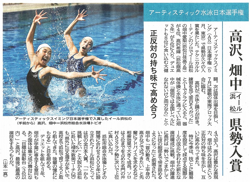 5月1日に東京・アクアティクスセンターで行われた、日本選手権水泳大会・アーティスティックスイミング競技で本校2年、畑中さんが個人4位、デュエット8位の活躍をしました。6月8日の静岡新聞に記事が掲載されましたので紹介します。