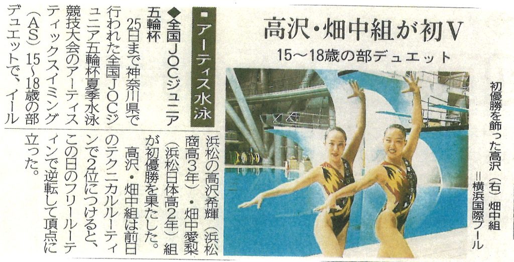 8月22日(火)~25日(金)に横浜国際プールで行われた第46回全国JOCジュニアオリンピックカップ夏季水泳競技大会にて、15~18歳の部デュエットで、高2年の畑中さんが、ペアの高沢さん(浜松商業高校3年)とともに見事初優勝を勝ち取りました。前日のテクニカルルーティンで2位につけて、翌日のフリールーティンでの逆転で勝利、初めての優勝を飾りました。