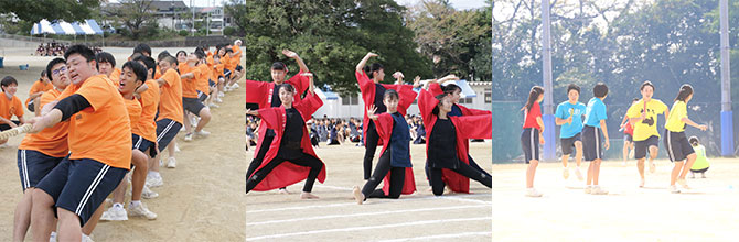 高校体育祭は3年体育委員会が中心となり、企画・運営のすべてを生徒だけで作り上げています。メインイベントの男子「エッサッサ」・女子「ソーラン節」に加え、3年体育委員会のサプライズが恒例となっています。また、HR対抗では最終種目の「男女混合リレー」が結果を左右するほど白熱しており、リレーを制したHRが総合順位の上位に食い込み、大優勝旗を手にすることが多いです。