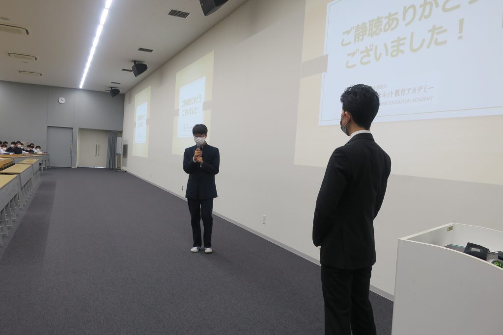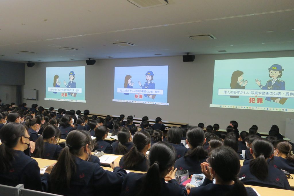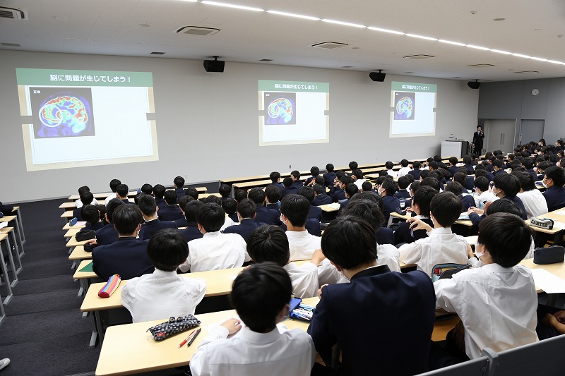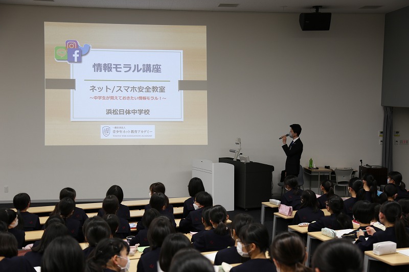 6時限目の時間にはともちホールにて、中学全学年を対象とした中学ケータイ安全教室が行われました。講師として「一般社団法人 青少年ネット教育アカデミー」より斎上 達先生をお招きして、ネットやスマホの危険性と、加害者にも被害者にもならないための正しい安全な利用について講習していただきました。
