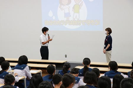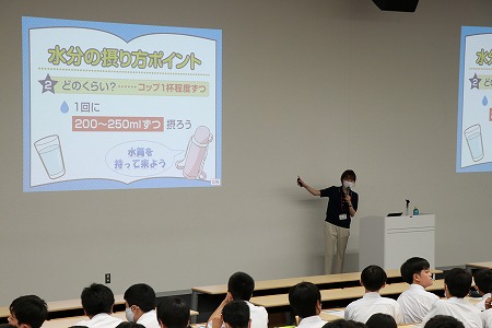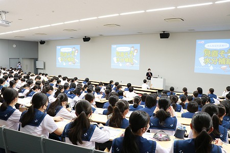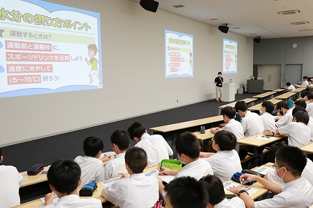 7月19日(水)4限、名古屋市の明治食品から講師として稲垣様にお越しいただき、「食育講座(夏の水分補給編)」を行いました。気温と体温が同じくらいの日が続く中、成長期の運動・勉強時の水分補給の重要性を学びました。