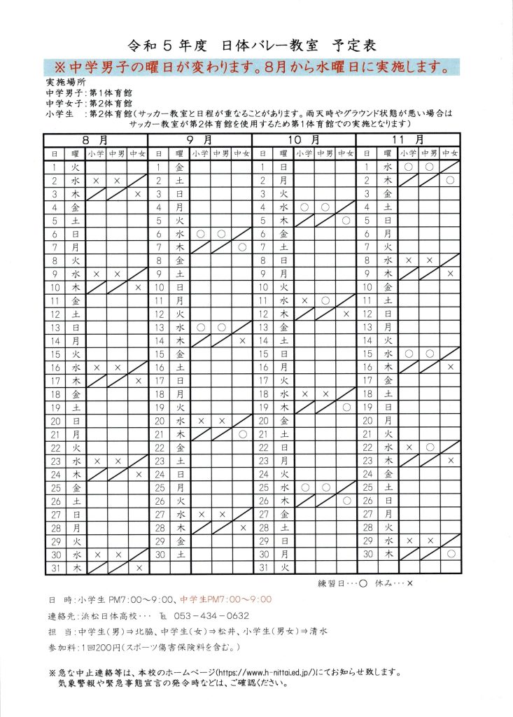 本校を会場にして行っている小学生・中学生対象のバレーボール教室の予定をお知らせします。8月から、中学生男子の曜日が木曜日から水曜日に変更になります。あわせて、小学生の実施場所が第二体育館に変更になります。ご確認ください。