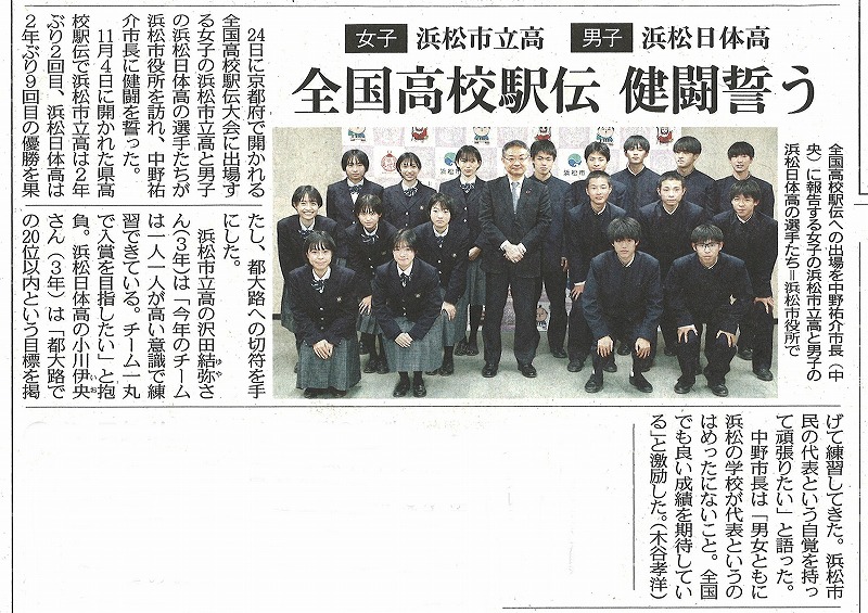 浜松日体高校陸上部の駅伝選手は、浜松市役所を訪問し中野祐介・浜松市長に全国高校駅伝に出場することを報告をしました。中日新聞に記事が掲載されましたので紹介します