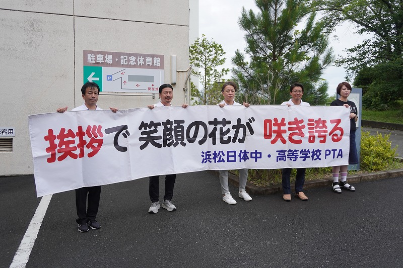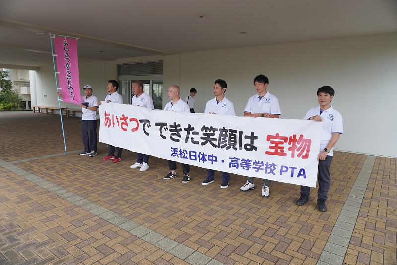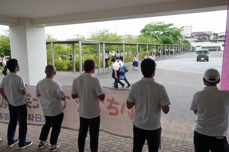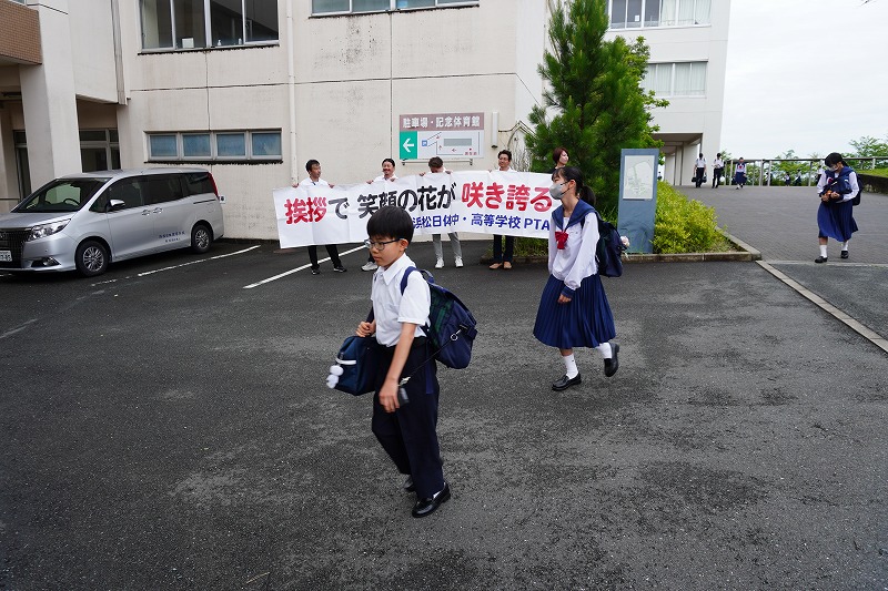 6/29(土)、月例のPTA朝のあいさつ運動が行われました。昨日の雨はあがりましたが、曇天で気温が高く湿気の強い朝になりました。それでも生徒たちは朝から元気よく登校をしていました。