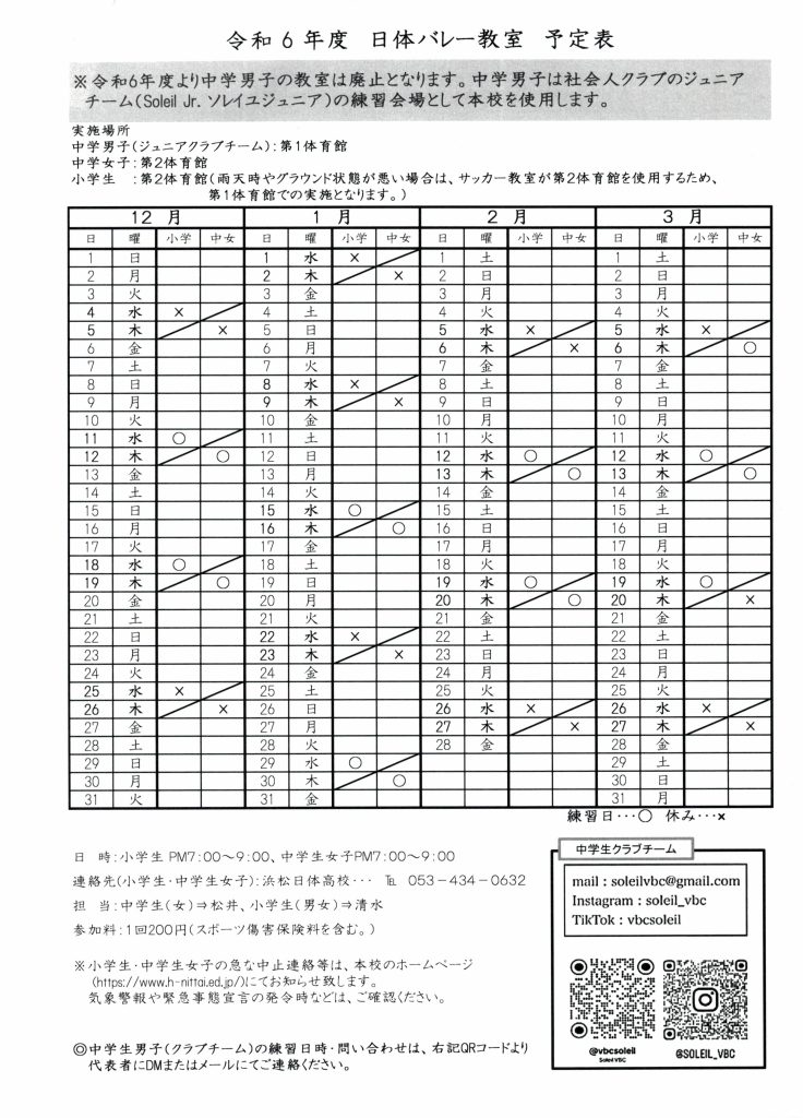 本校を会場にして行っている小学生・中学生対象のバレーボール教室の予定をお知らせします。