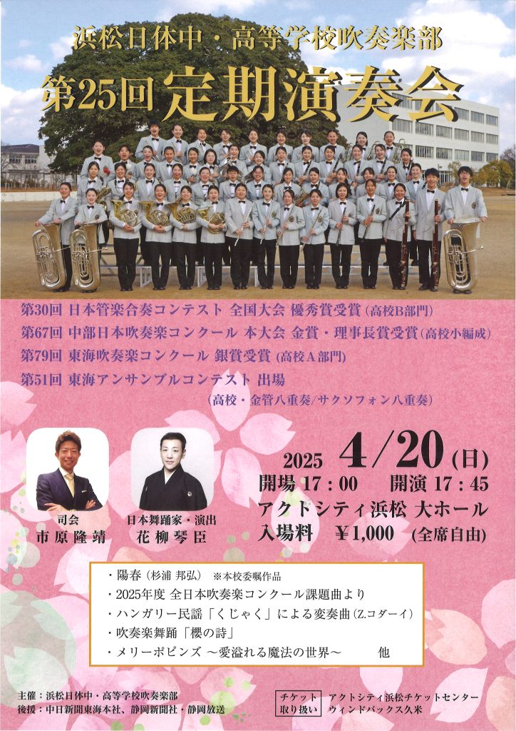 以下の計画で吹奏楽部「定期演奏会」が行われます。チケット入手につきましては、アクトシティ浜松チケットセンターへ問い合わせください。