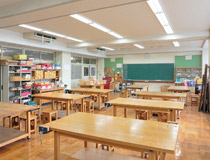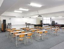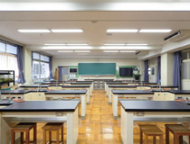 横に広いので生徒と先生との距離が近いのが特長です。木製の建具があたたかく、心が落ち着く空間で授業に臨むことができます。冷暖房も完備されており、また、照明も目に優しい設計となっています。